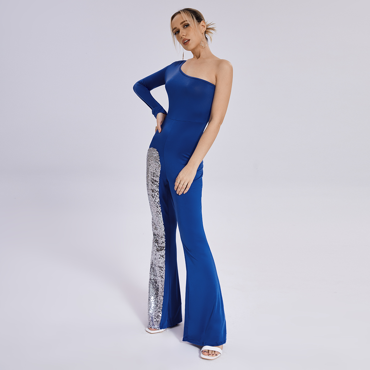 Leg Jumpsuit Mesh One Sleeve Flared