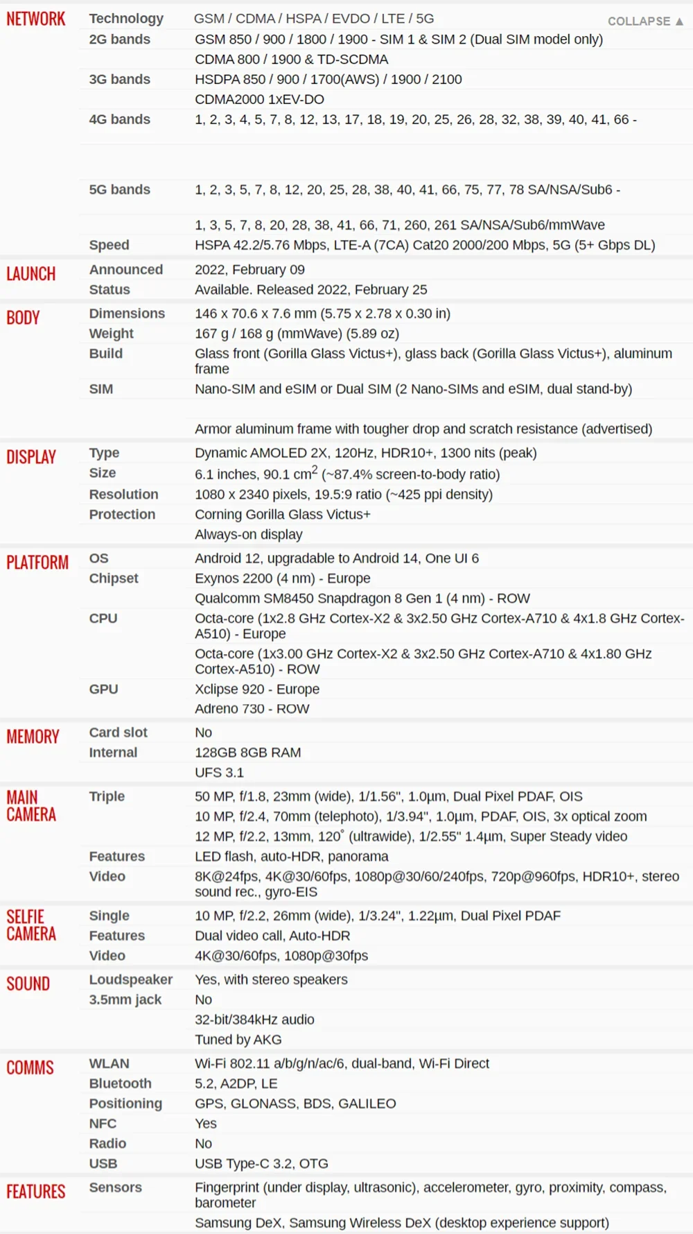 Core specifications Product name. Samsung Galaxy S22 5G S901U1 Display. 6.1 inch AMOLED RAM. 8GB Storage. 256GB Processor. Snapdragon Octa Core Network. 5G Security. NFC, fingerprint, face unlock Operating system. Android with One UI